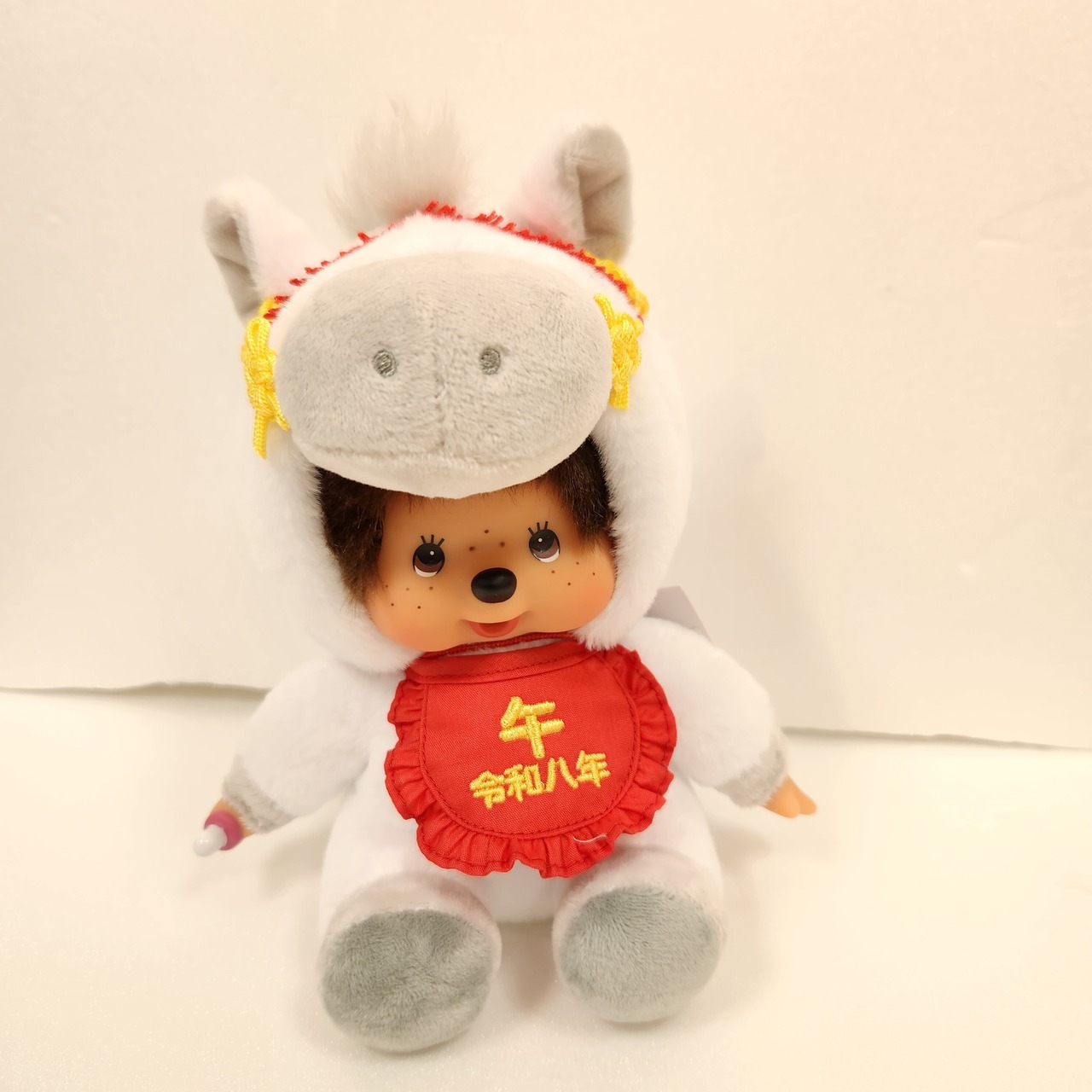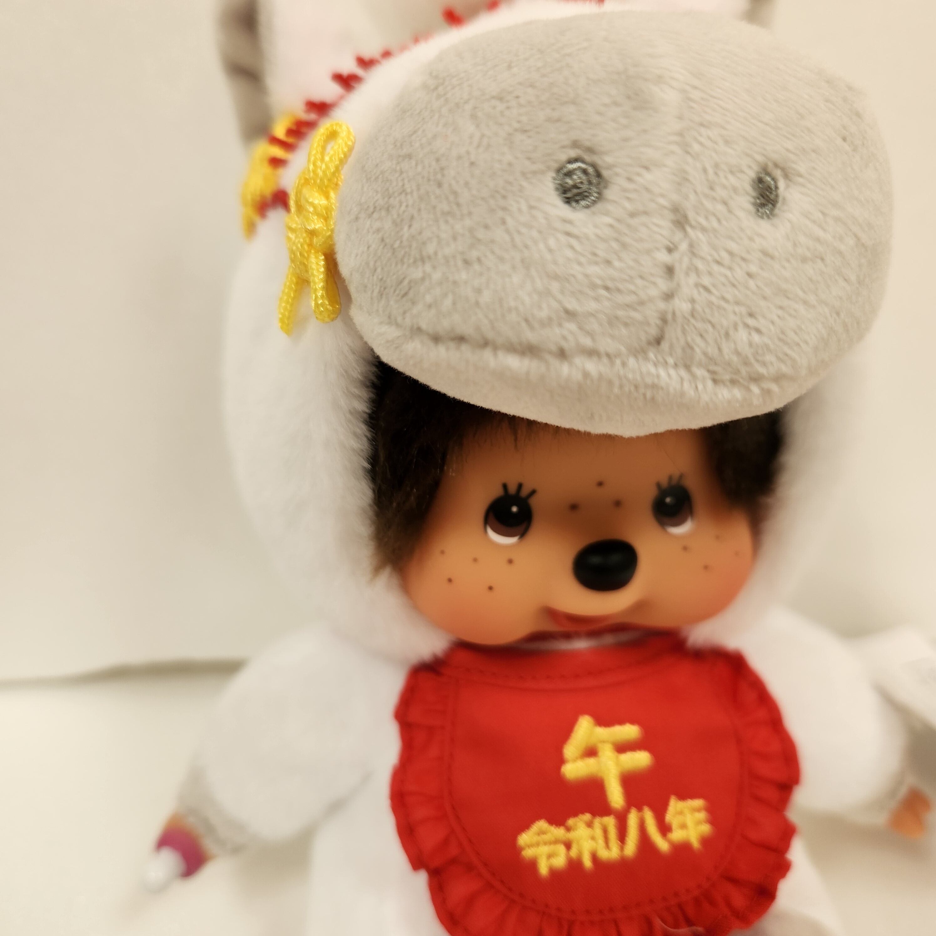 モンチッチくんは白馬姿で午年をお迎えするよ。 「2026年み~んな、きっとうま(午)く行きますように☆彡」と願っています。 うま全身の艶のある白色ボアと、たてがみ・しっぽの長毛でふわふわの柔らかいライトグレイのボアはポリエステル製です。 鼻面、蹄は毛足の短いさらりとしたポリエステルボア製です。 午の目は黒色のプラスティックアイパーツでキラリと光っています。 フリル付きスタイの平生地と房飾りや組紐は赤色で、スタイの「午(うま)令和八年」の文字刺繍と飾り結びの黄色がアクセントになっています。