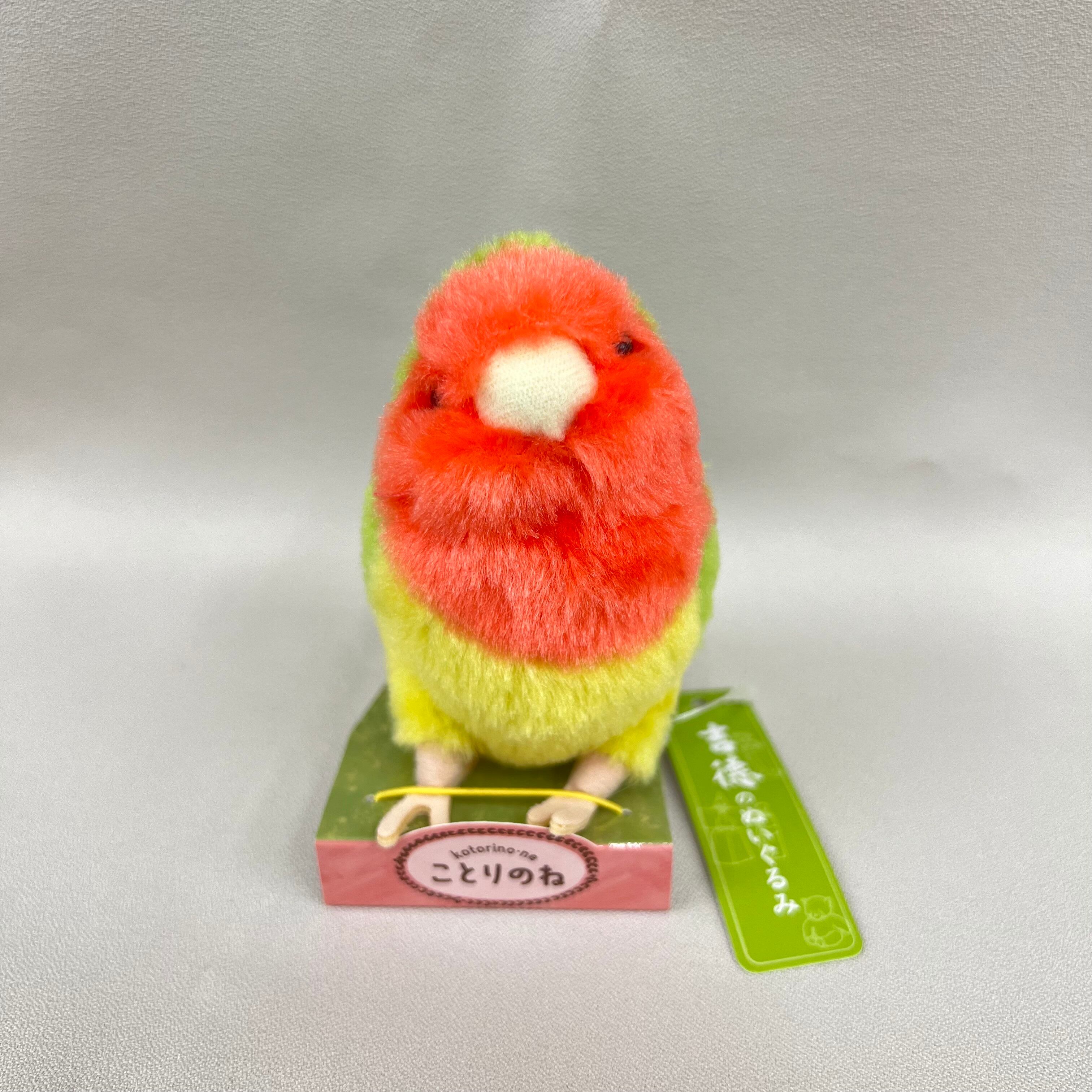 ことりのね コザクラインコは、かわいいインコのぬいぐるみです。思わず触れたくなるふわふわの手触りと、愛らしい表情が特徴。お部屋のインテリアとして飾っても、ぬいぐるみとして抱きしめても楽しめるアイテムです。