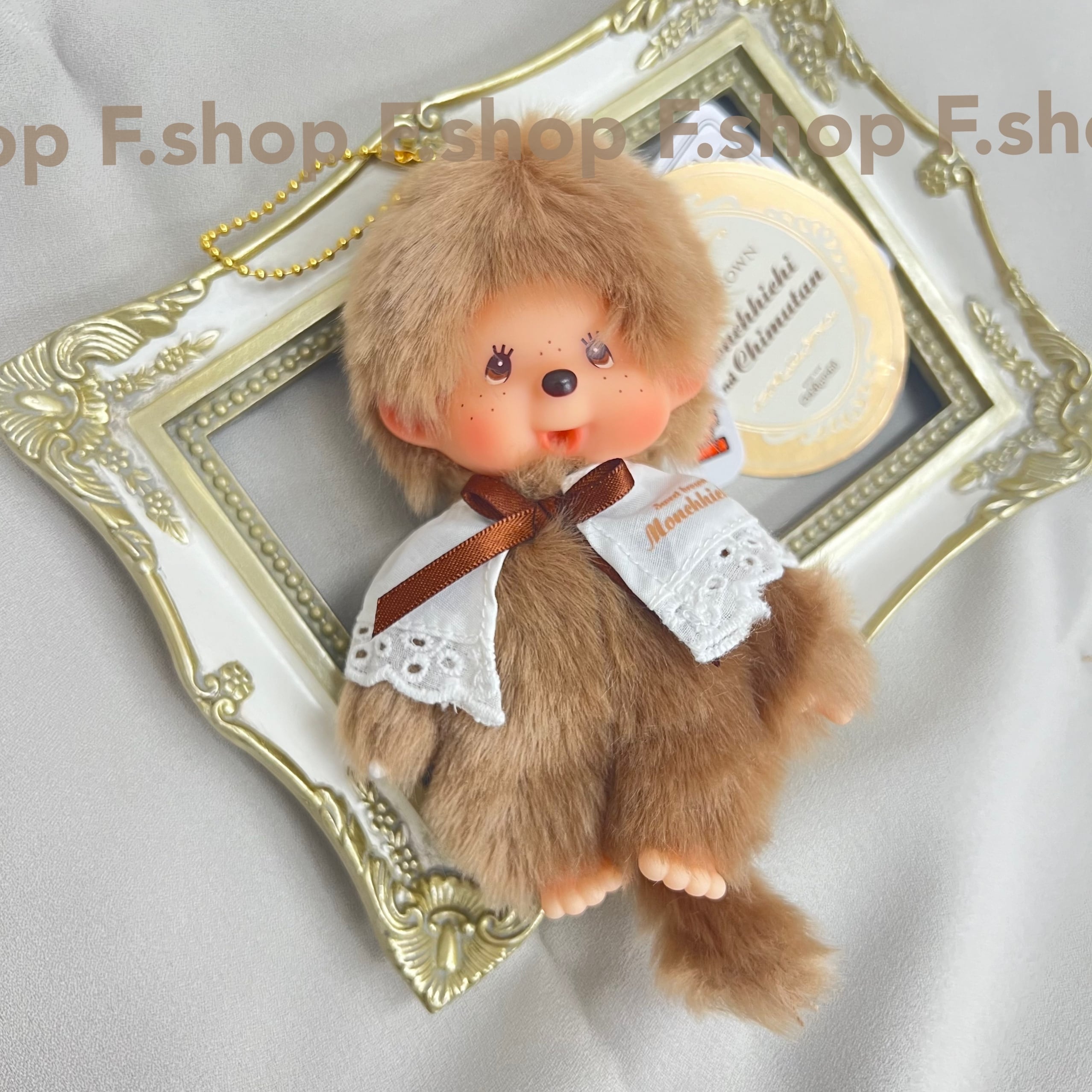 ケープには「Sweet Brown」とモンチッチロゴがプリントされています。 ケープは胸元で糸止め固定されています。 モンチッチキーチェーンは男の子です。 ゴールドカラーのボールチェーン付きです。